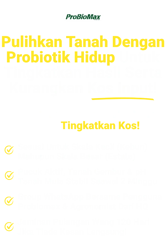 ProBioMax ialah Gabungan Probiotik Hidup + Asid Amino Gred Tinggi Yang Bertugas Memulihkan Ekosistem Tanah, Mengaktifkan Akar Dan Menjadikan Pengunaan NPK Lebih Berkesan & Dos NPK Berkurang Sehingga 60%